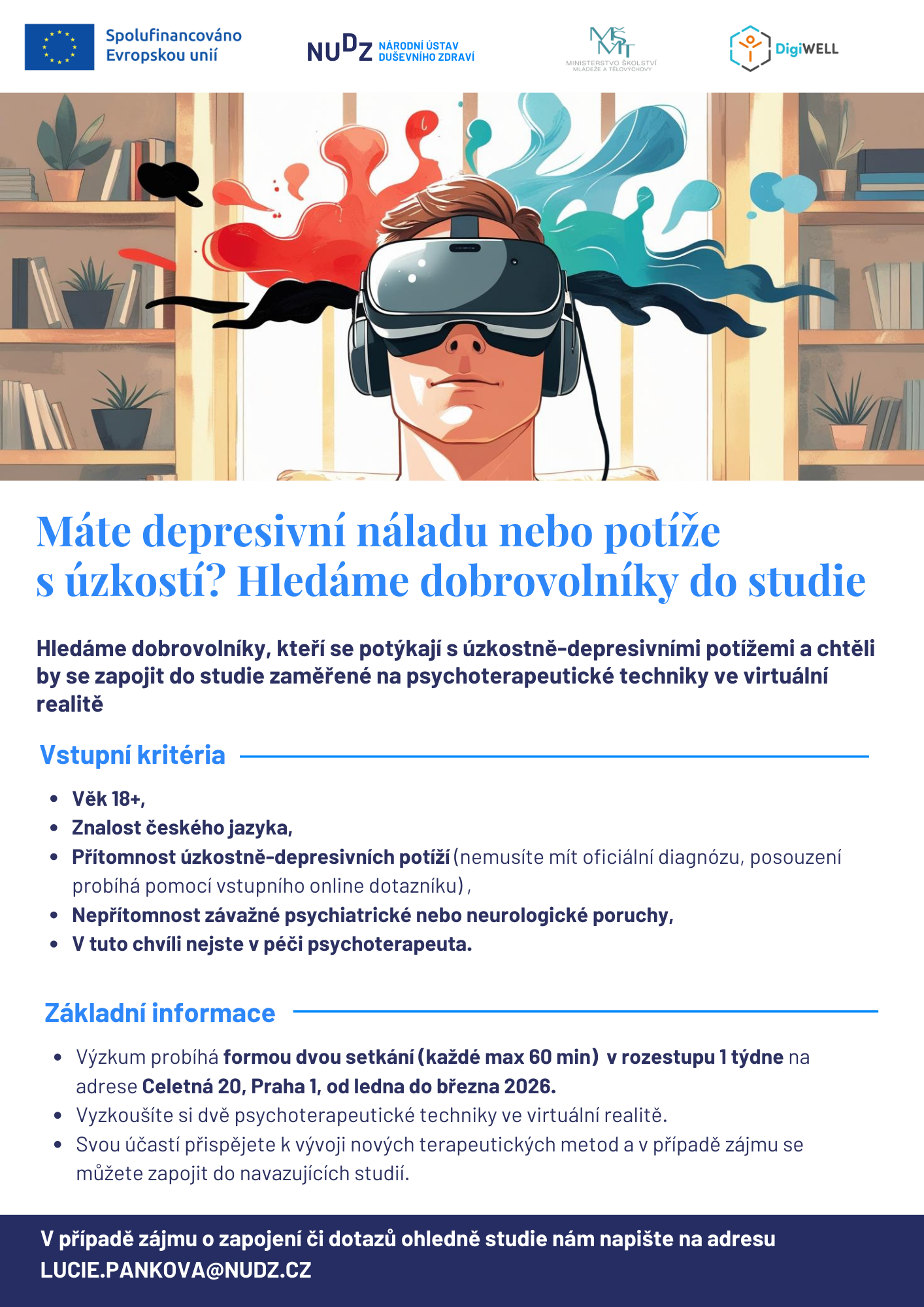 Hledáme dobrovolníky, kteří se potýkají s úzkostně-depresivními potížemi a chtěli by se zapojit do studie zaměřené na psychoterapeutické techniky ve virtuální realitě.