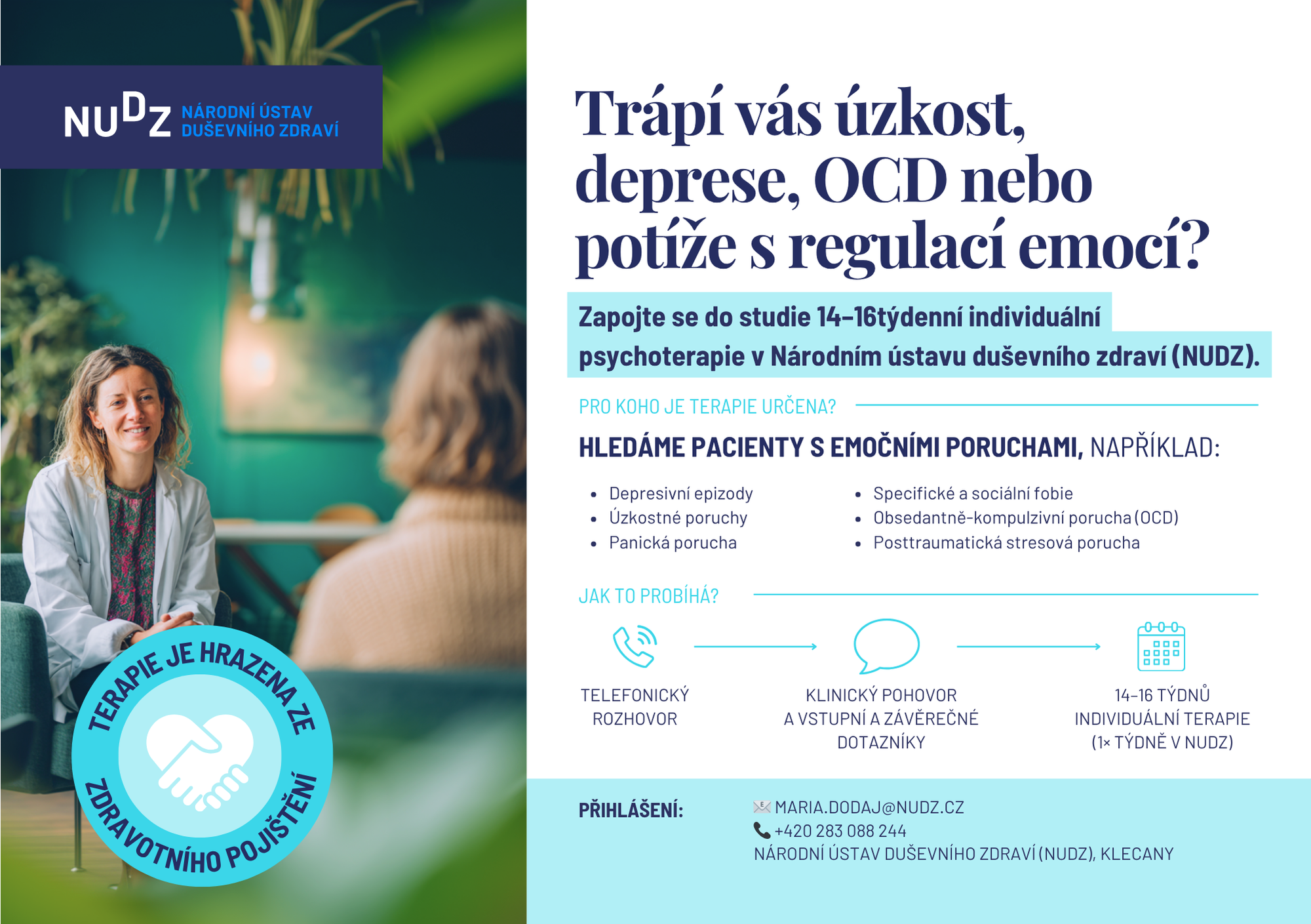Potýkáte se s úzkostí, depresí, OCD nebo s potížemi týkající se regulace emocí? Zapojte se do studie 14-16týdenní individuální psychoterapie v Národním ústavu duševního zdraví. Terapie je hrazena ze zdravotního pojištění.